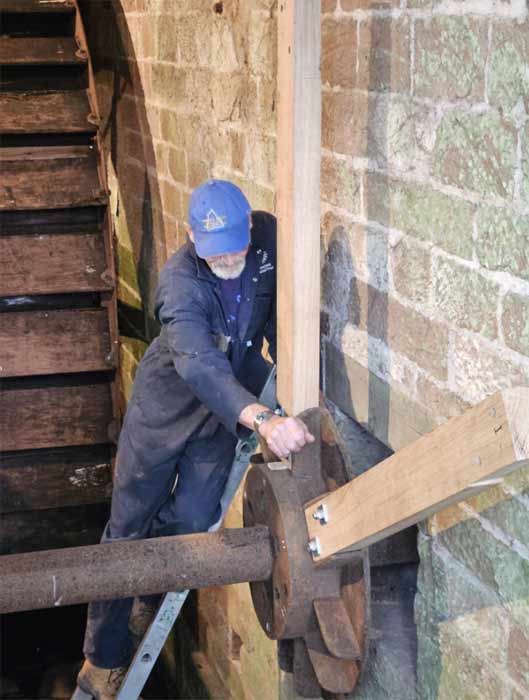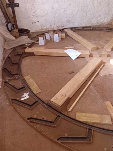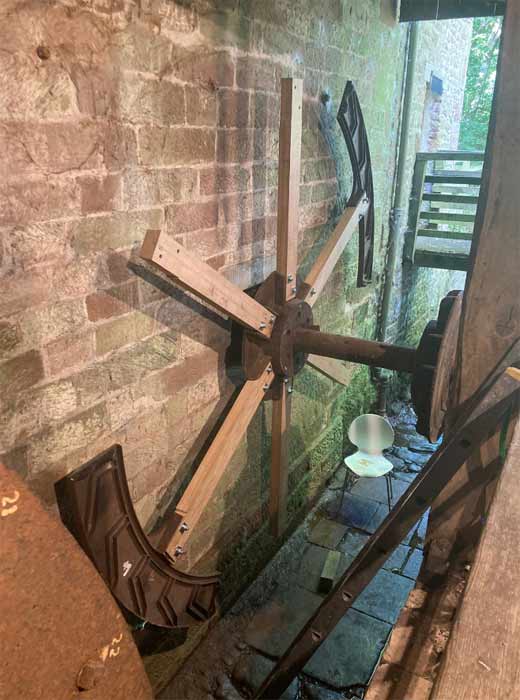 Building the water wheel started in the late Summer 2025. One set of shrouds were laid out on the floor inside the mill and the oak arms were carefully shaped and cut to length. The arms were then installed onto the hub on the wheel axle. Finally the shrouds were installed one at a time, keeping the wheel balanced in the process. The inboard shrouds, which were the newly cast ones, were installed first. The process was repeated for the second set of shrouds.