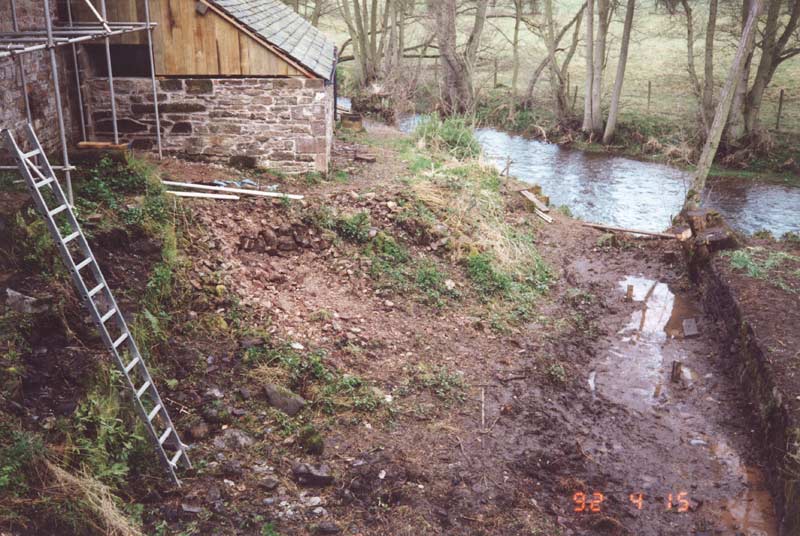 The masonry of the North (river side) wall was unstable and so this was dismantled carefully so that it could be rebuilt with the dressed stones in their original positions. This allows us to see the original curved scratch marks made by a wheel running out of true where the second wheel would have been.